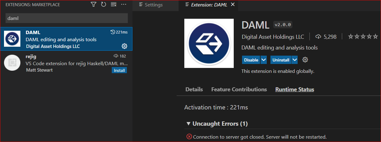 I have the 2.0 extension but i see it has a runtime error (“Connection to server got closed. Server will not be restarted.”).