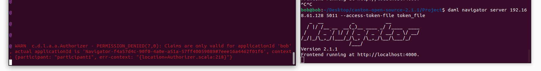 WARN c.d.l.a.a.Authorizer - PERMISSION_DENIED(7,0): Claims do not authorize to read data for party ‘bob::122033f10bca62fab35e0d8c3abee47abc23b78c8d91c90841ad7d4956c984eefecc’, context: {participant: “participant1”, err-context: “{location=Authorizer.scala:218}”}