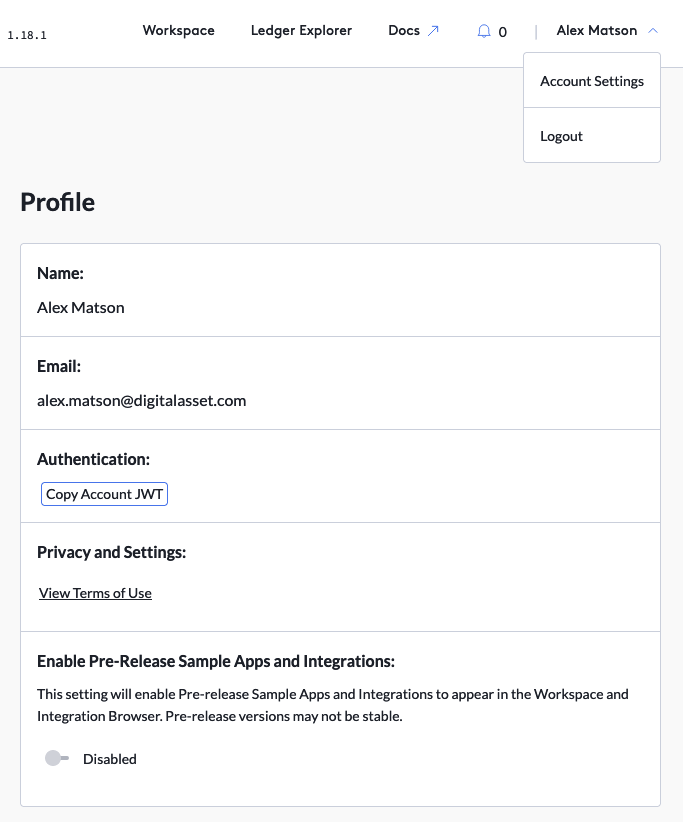 To authenticate the CLI, you need an account token. To retrieve an account token, log into Daml Hub, navigate to your Account Settings (under your profile menu), and click on “Copy Account JWT”.