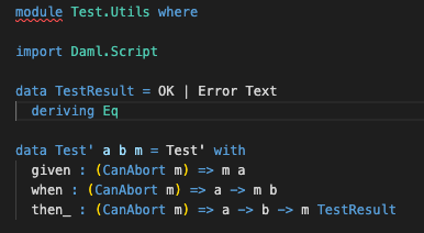 given, when, and then_ to be polymorphic over m even given a single Test' value. Your declaration means that each Test' serves exactly one m; if that is not what you mean, remove m from Test''s type parameters, and type given : forall m. (CanAbort m) => m a and likewise for the other functions. (Because this is a more exotic form of type polymorphism, Daml can’t figure out where the m should be inferred otherwise.)