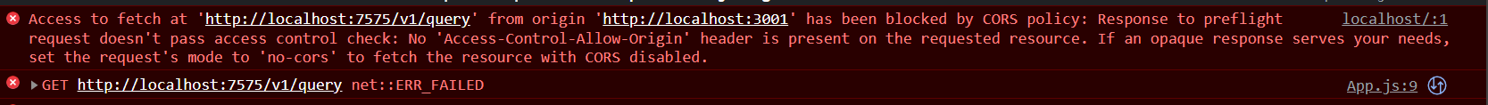 but while hitting the same url (‘http://localhost:7575/v1/query’) with react i am getting CORS issue