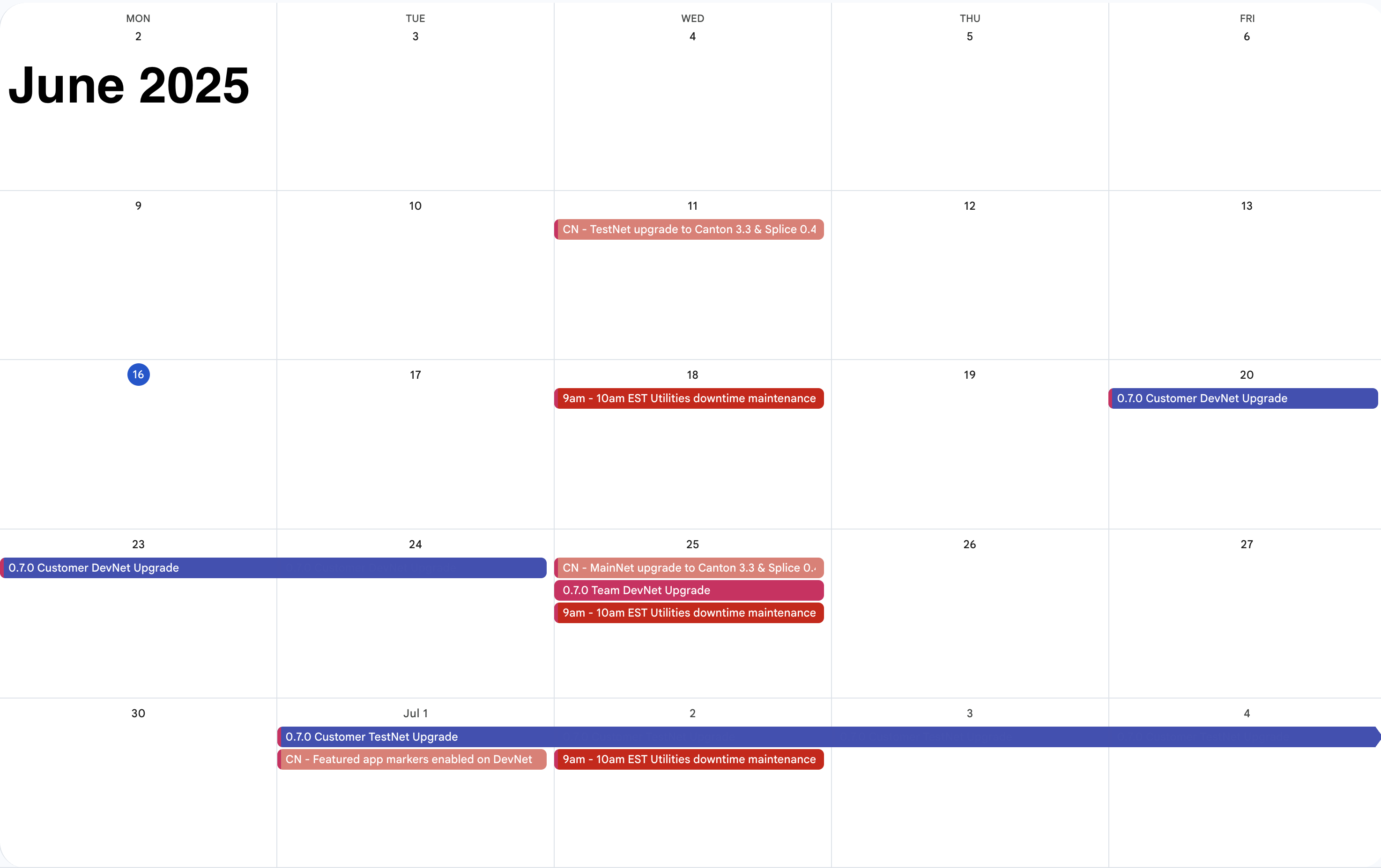 A heads up that we’re planning a 0.7.0 release for this Friday June 20th with dar and UI changes to support the release of ‘featured app activity markers’ and token standard asset allocations on the Canton Network. All node operators will need to upgrade the different environments in the windows listed below and will need to upgrade by the ‘no later’ date, otherwise the Utilities will not work. I’ve also included a calendar view in the screenshots attached to better visualize the dates; upgrade windows are marked in blue.