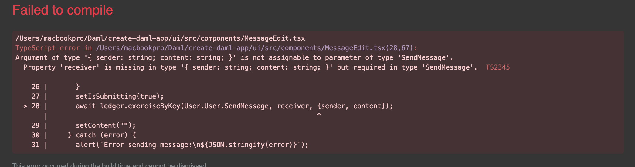 " Add a new feature with UI elements to your Daml app" on Step 5 of 7. I get this error in my VS Code and when compiled I get the error below kindly see screenshot. Let me know if I need to do fixing on other code but I just actually followed what is on the step.