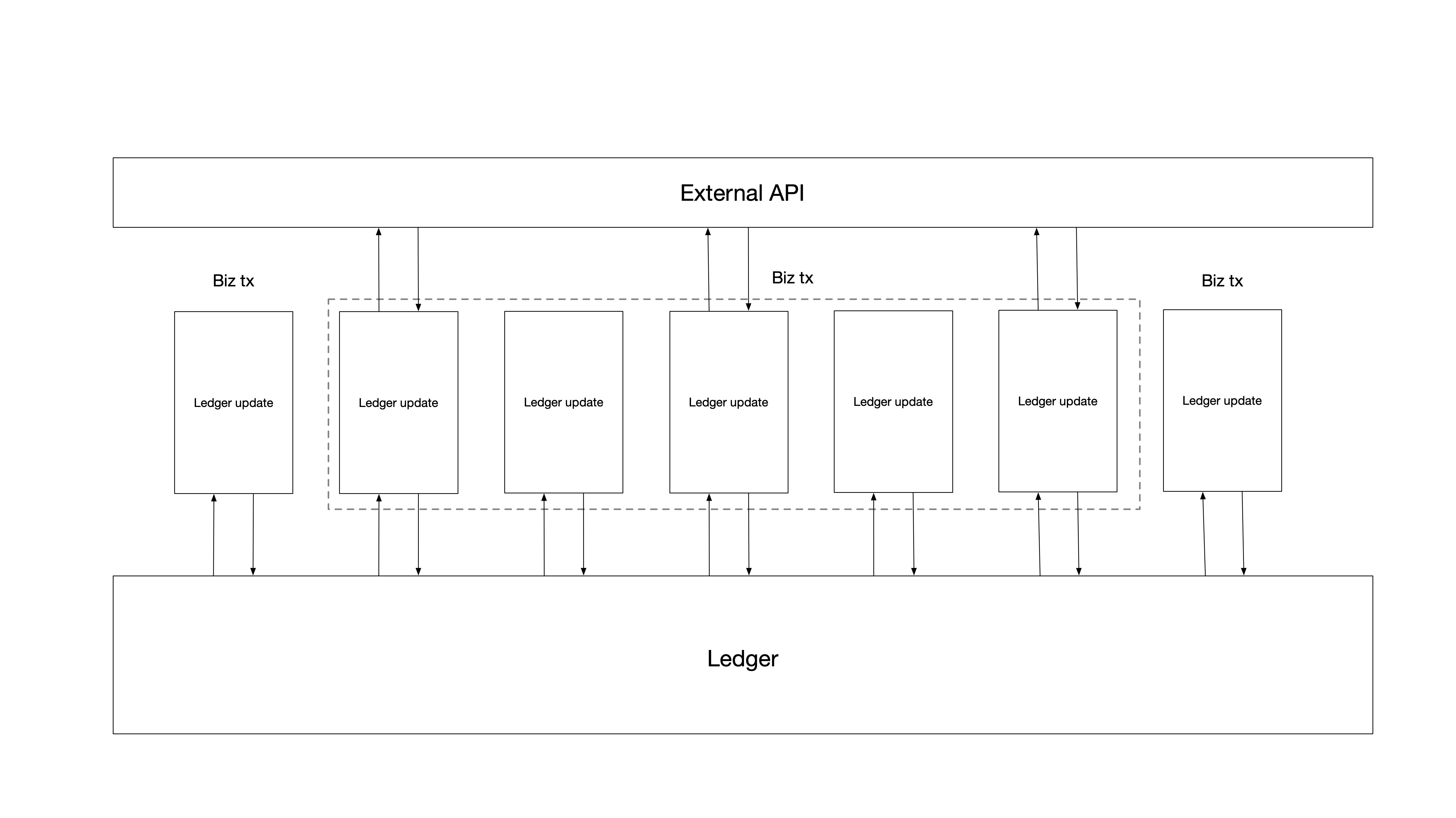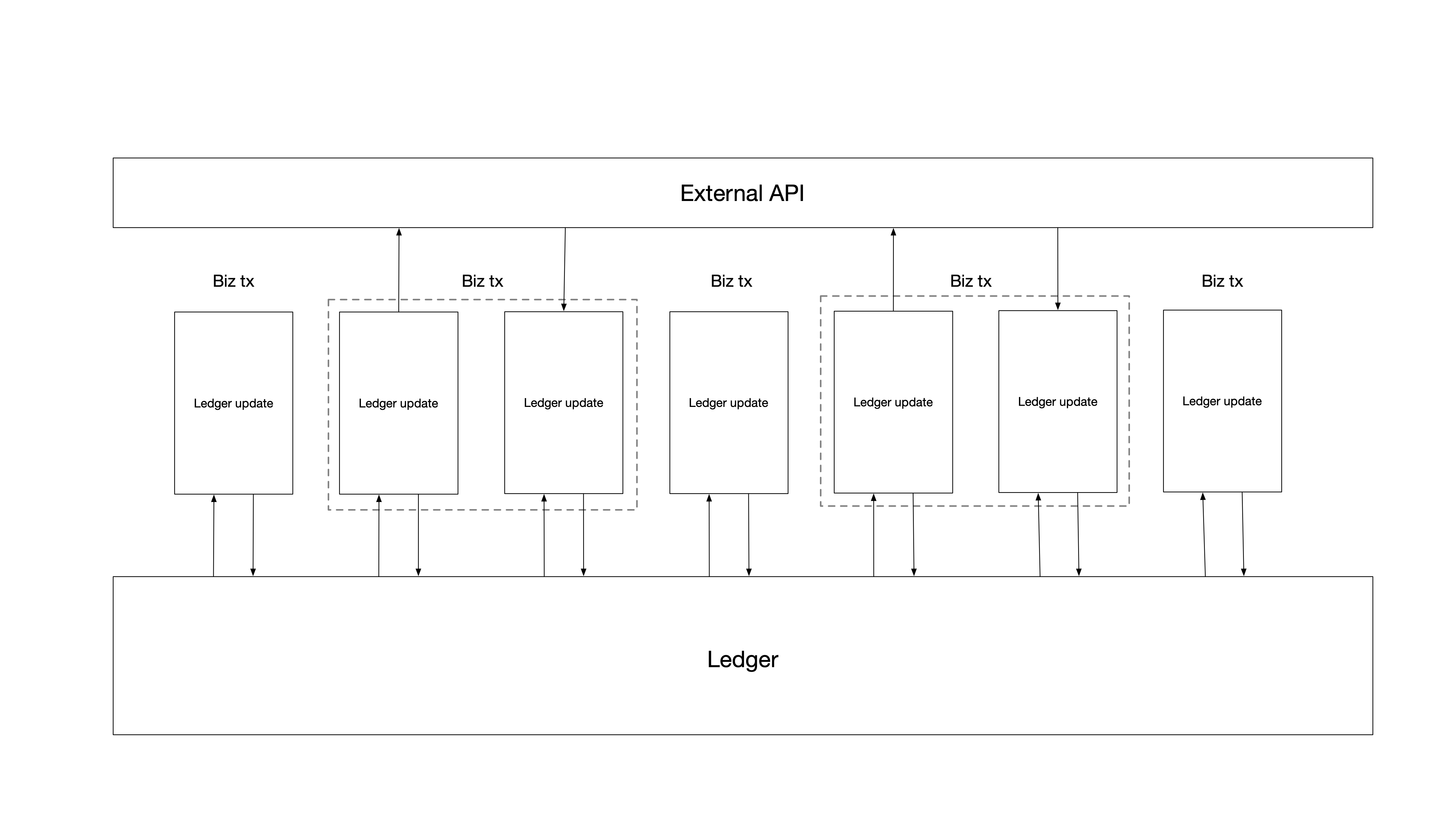 Consider the scenario where the external API is down: the ledger update and the external API request somehow exist, but not as a transaction because transactions cannot be modified after they have been “committed” to a ledger. They’d have to somehow exist in a different, mutable way that would “change” to a finalized request/response pair. Or if you kept them requests the transaction stream entirely until responses were done, you couldn’t look at the ledger to know that an outstanding request is in flight.