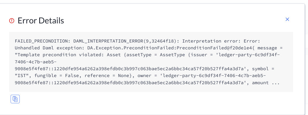 FAILED_PRECONDITION: DAML_INTERPRETATION_ERROR(9,32464f18): Interpretation error: Error: Unhandled Daml exception: DA.Exception.PreconditionFailed:PreconditionFailed@f20de1e4