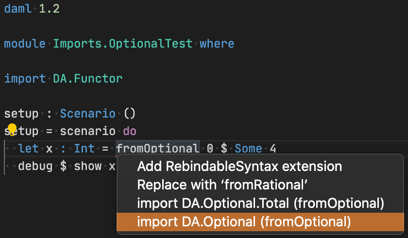 Because I was certain it offered me fromOptional the way I described I started to play with it. If you add an import for instance to DA.Assert then all of a sudden fromOptional appears in the suggested imports. E.g.: