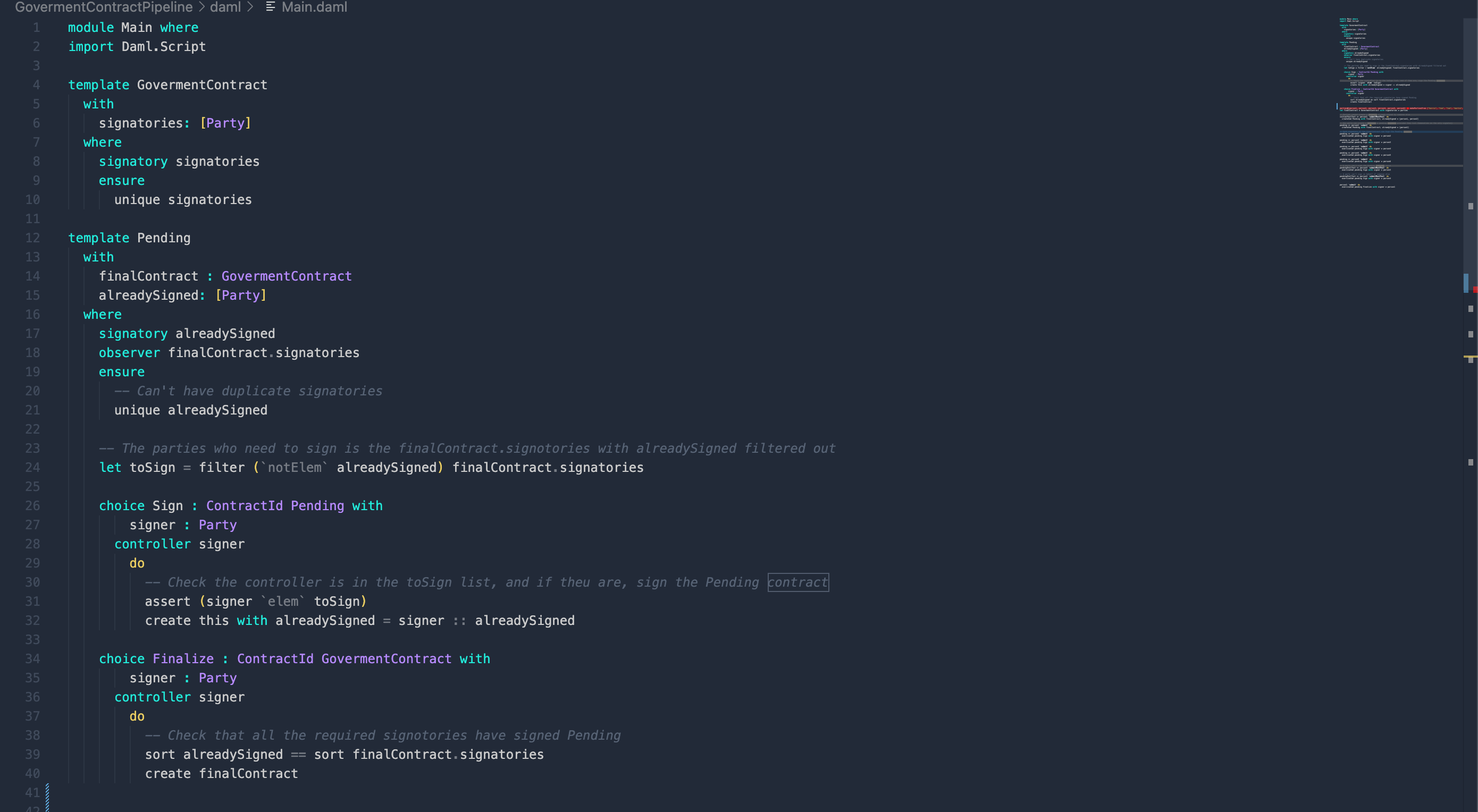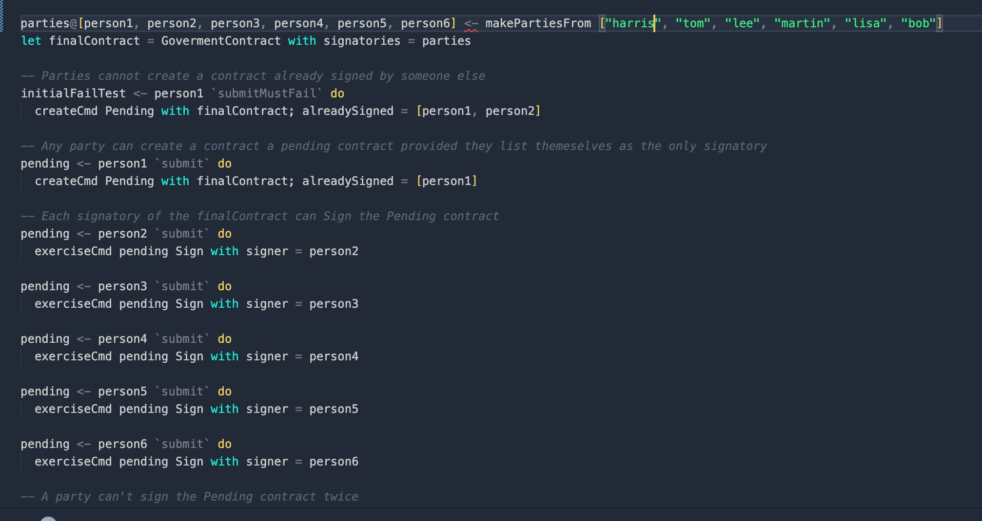 So I went through and added the fail_test = script do parties@[person1, person2, person3, person4, person5, person6] <- makePartiesFrom["harris", "tom", "lee", "martin", "lisa", "bob"] let finalContract = GovermentContract with signatories = parties. It don’t fix the issue but gave me more errors on the unique signatories saying they were not in scope. What determines the scope?