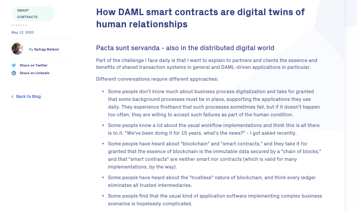 Here’s a nice blog post by @gyorgybalazsi on how DAML smart contracts are digital twins of human relationships.