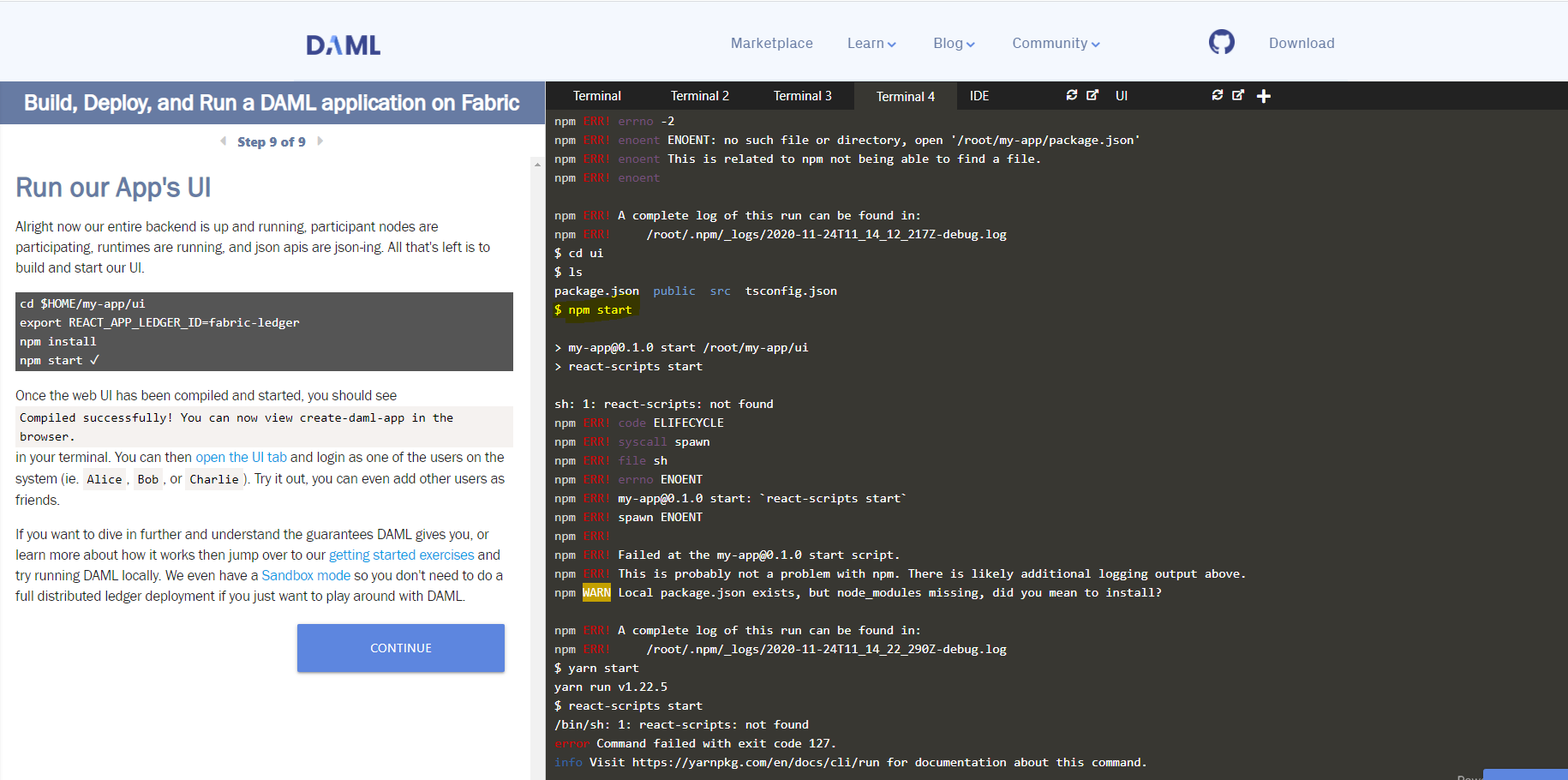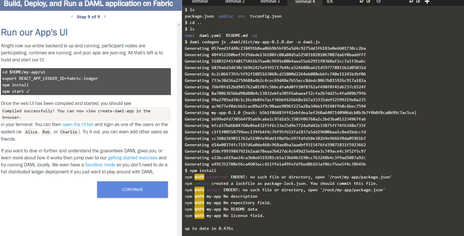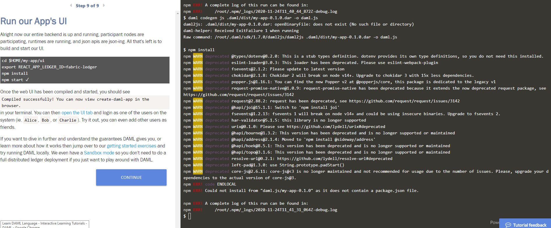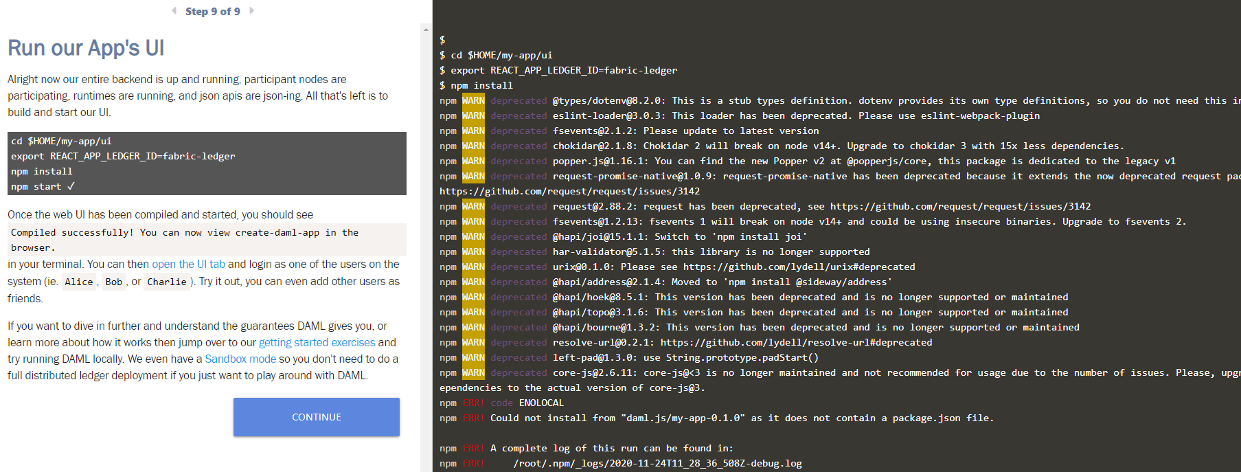 Which instructions are you following? Step 9 in GitHub - digital-asset/daml-on-fabric: Enabling DAML applications to run on Hyperledger Fabric is about authentication not the npm server.
