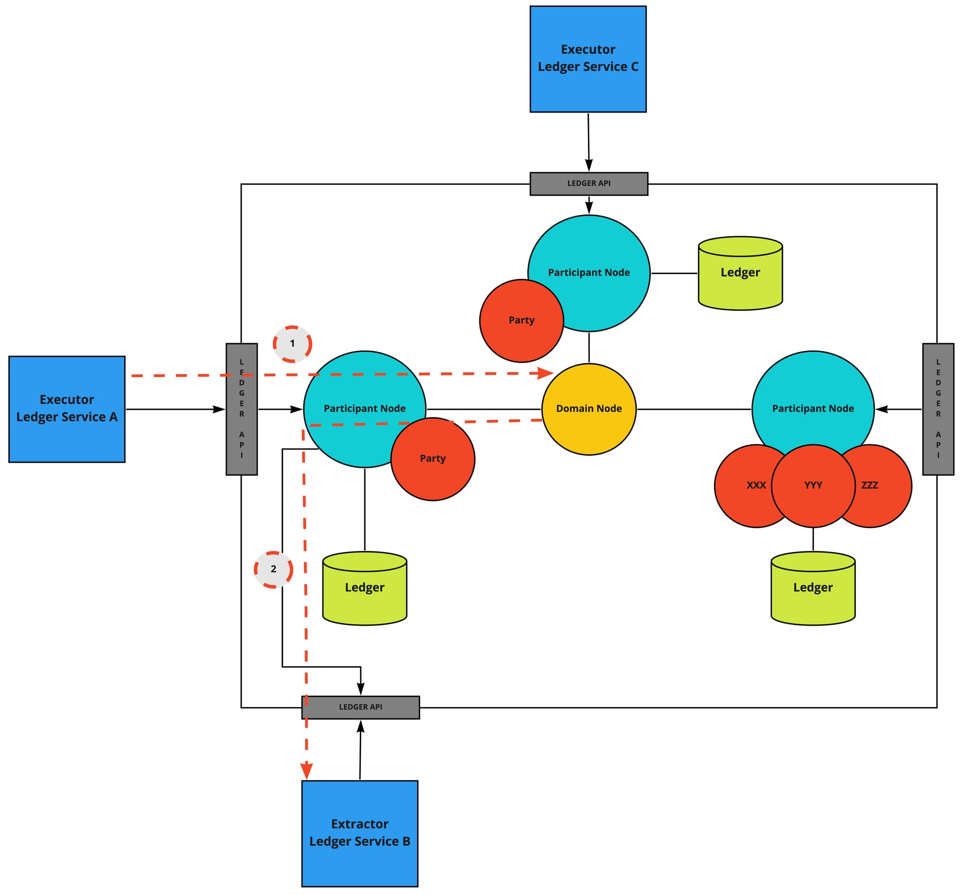 I am currently working on the implementation of a DAML ledger with various microservices interacting with it. Practically this translates to various executor services, which call the Ledger gRPC API from a particular participant node to exercise/create contracts; and extractor services, which set observers to the gRPC stream of transactions.