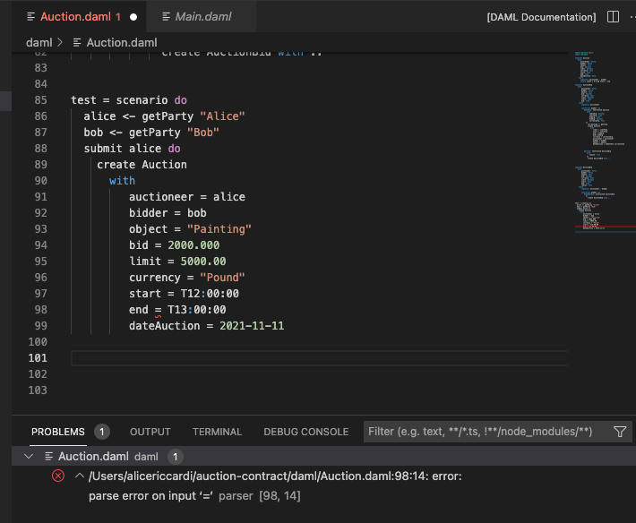 Hello everybody! I’m currently working on an Auction Contract for my Master dissertation. I’m having some troubles with testing the contract by using the command scenario. In order to do that, I’ve been following this Testing using scenarios — Daml SDK 1.12.0 documentation page on the Daml website. At some point it displays a parse error and I don’t understand what’s wrong. Maybe the format for the time and date is incorrect? Can someone please take a look at it and let me know what can i do to make the error go away. Thank you so much in advance for the help.