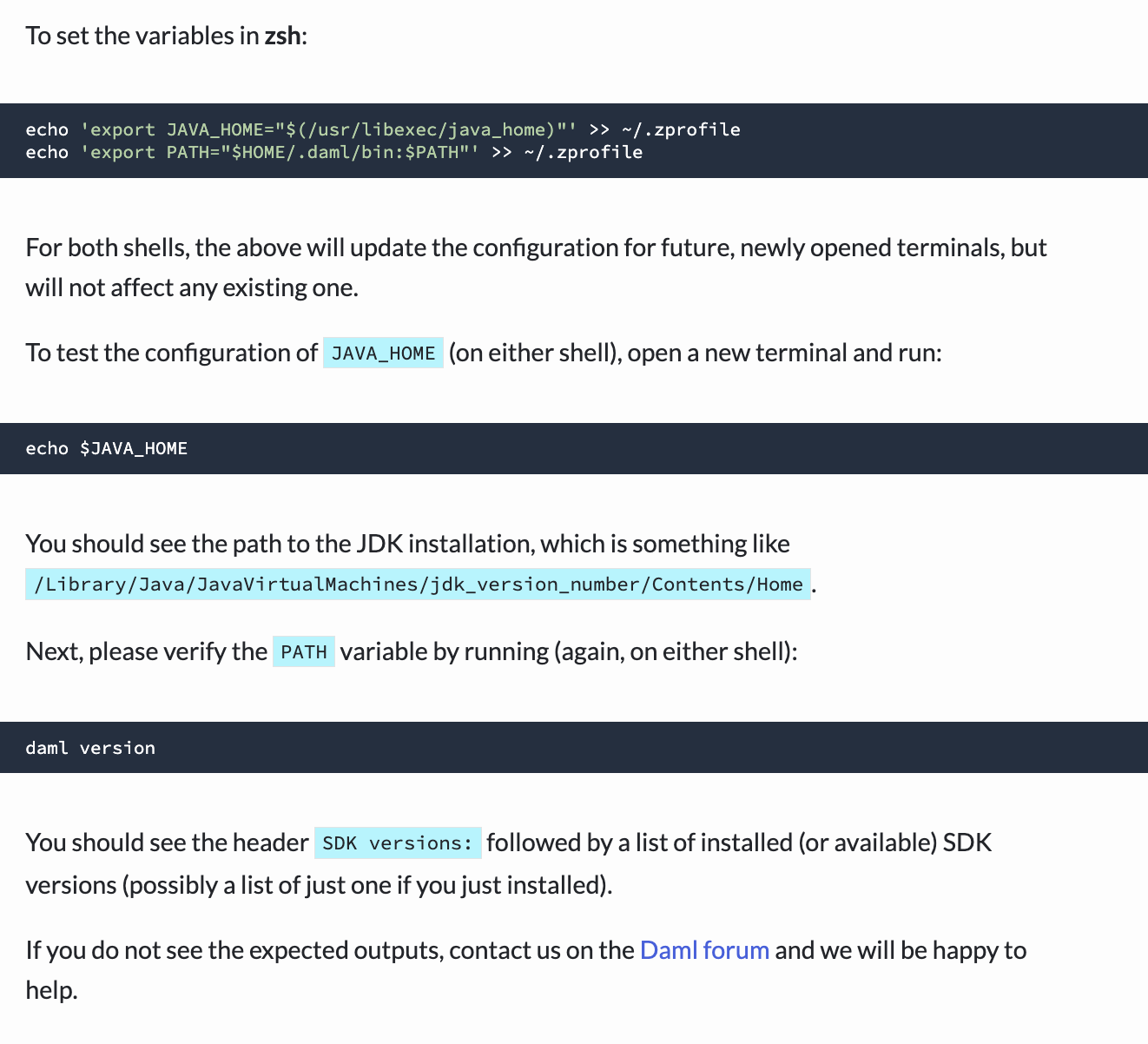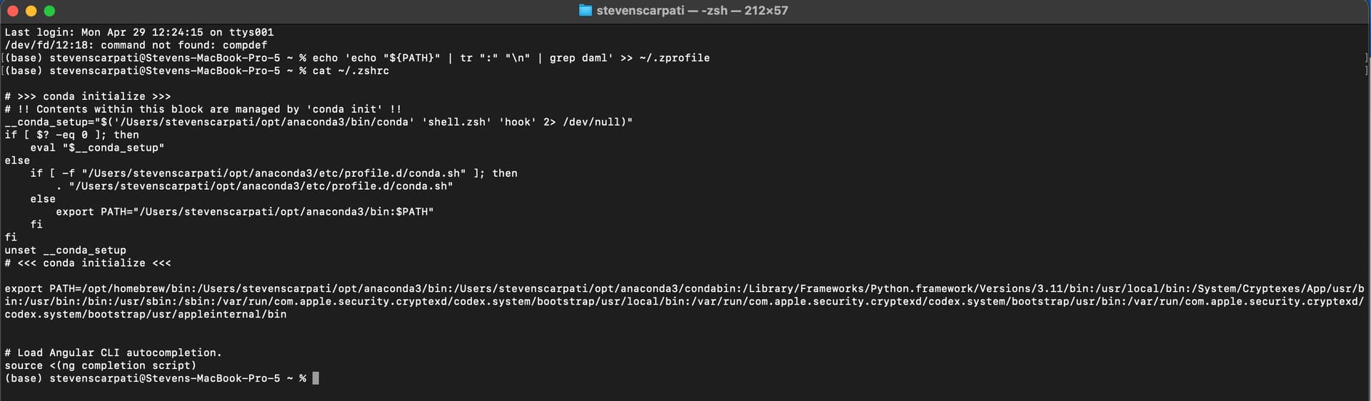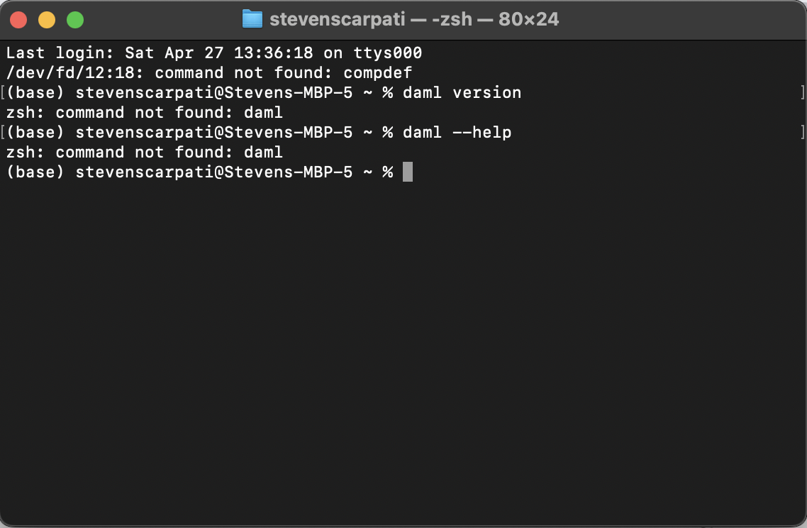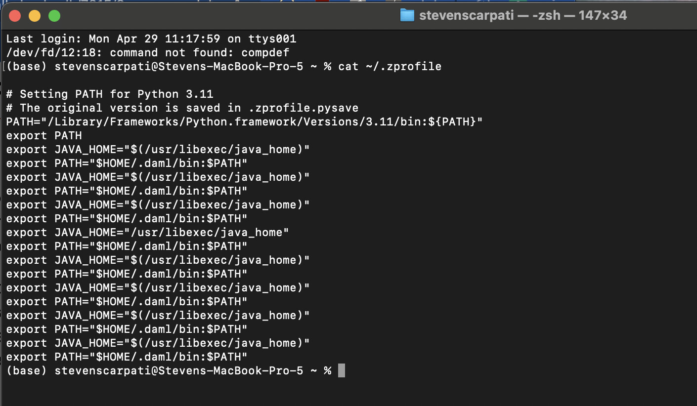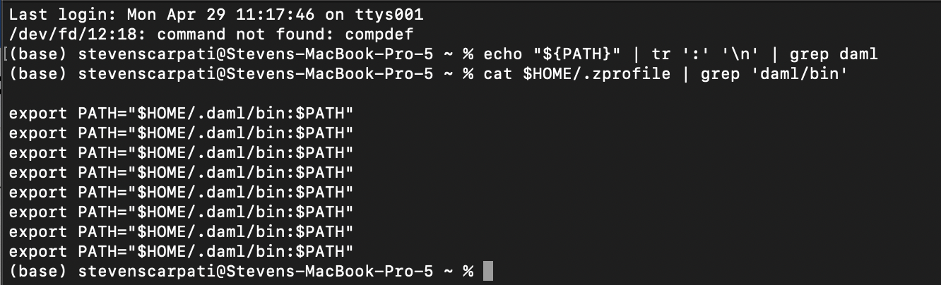 If both messages appear right away, then I’d try adding our first command, echo "${PATH}" | tr ':' '\n' | grep daml, at the end of your ~/.zprofile, right before the echo Bye!. If you see nothing in-between Hello! and Bye!, then I’m out of ideas without seeing your ~/.zprofile. If you see the expected /Users/stevenscarpati/.daml/bin in-between the two, it means that ~/.zprofile sets your PATH as expected, but something else resets it afterwards.