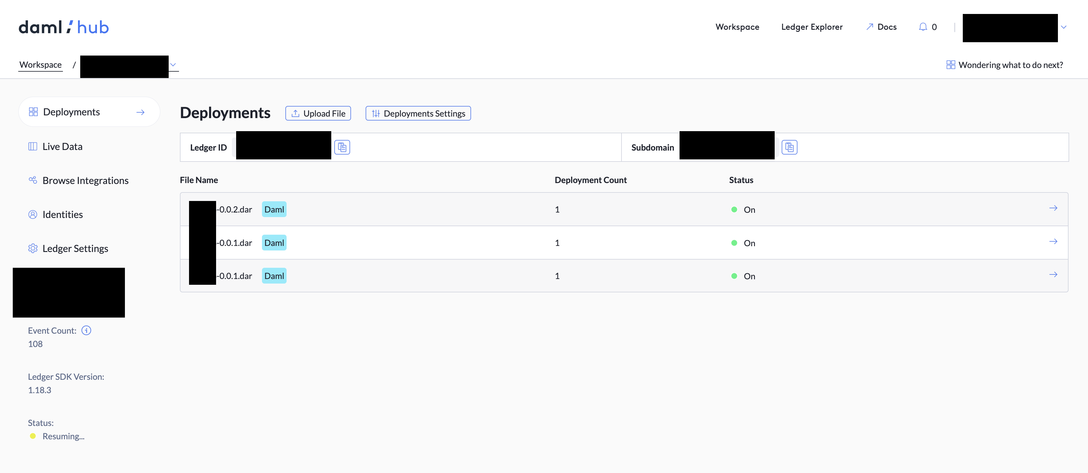 I have a workspace on Hub that I’ve been uploading my project to. The version for my project was 0.0.1 as all new daml apps are and I uploaded the dar file to Hub. Then I added more modules and templates to the app and uploaded the new dar file, still with version 0.0.1. I noticed that the new deployment was on a separate line under deployments and if I clicked into it, only showed the new modules/templates. Then I added more to the project (more modules and templates) and this time decided maybe I should bump the version to 0.0.2; I created the dar file and uploaded that now, so my workspace looks like this.